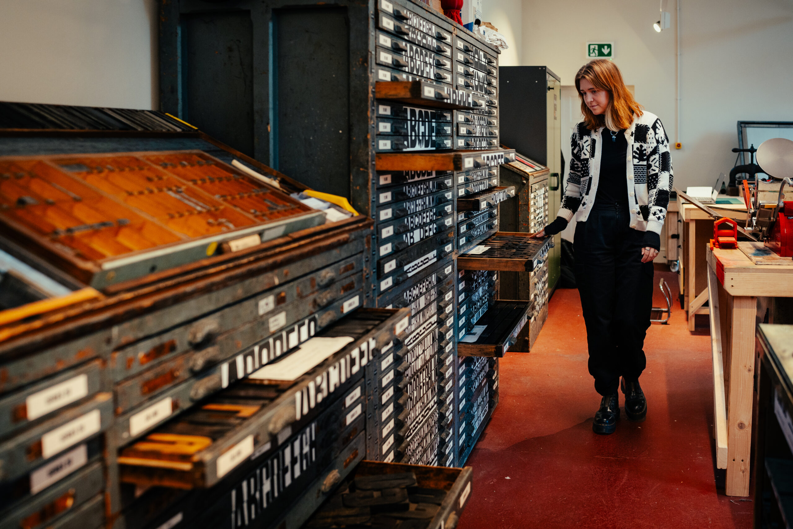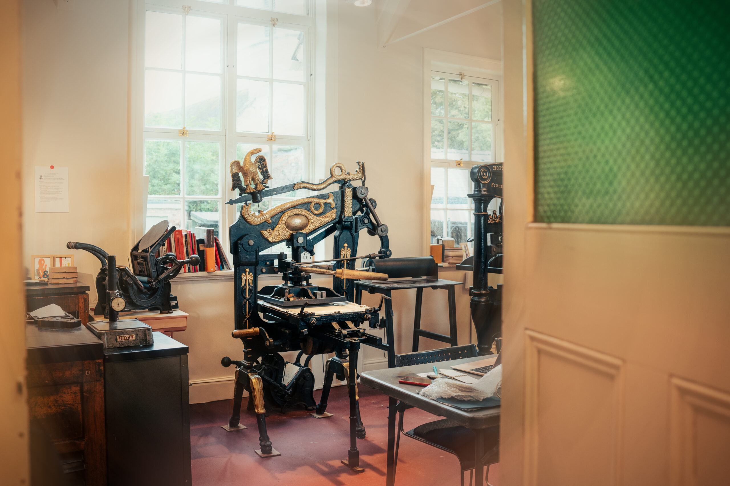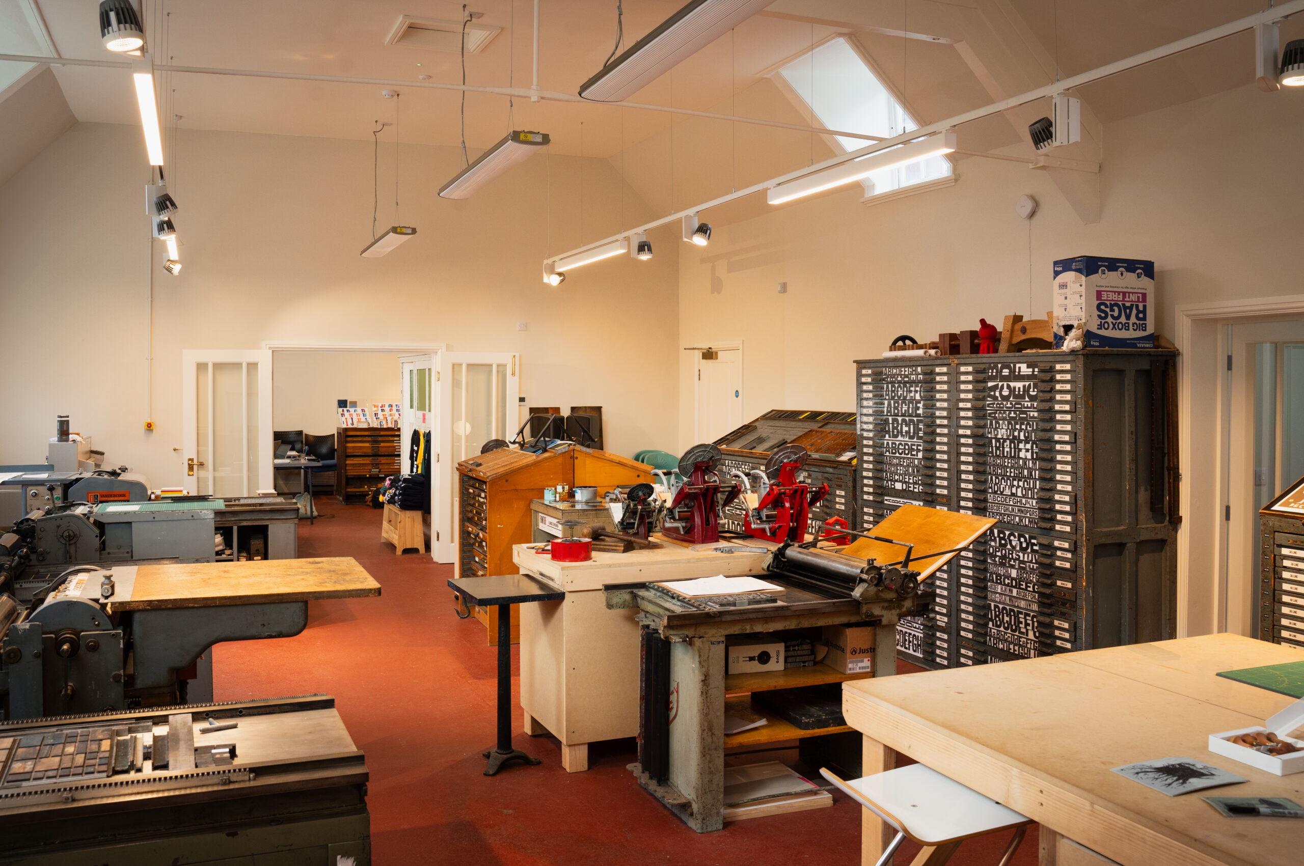 Equipment includes: Vandercook SP15 (x2), FAG, Vandercook Universal I, proofing press (x2), Adana 8 x 5 (x2), a large Albion and an 1845 Crown Columbian press; RISO SF5350 with the colours aqua, fluorescent pink, sunflower, black, and bright red; lino tools, including bench hooks and cutters; Kobo 338 hot foiler with a 8 x 5 inch printing area; 100 cases of metal type and 115 cases of wood type; book binding tools and presses; IDEAL 6550-95EP guillotine; a large FAG light box; workspace; and a library of reference books. Free consumables include a full range of Pantone inks, foil for hot foiling, proofing paper, newsprint, cleaning materials (white spirit, gloves and rags), linen thread, and RISO masters.